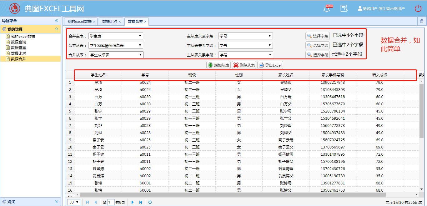选择需要合并的主表、从表的显示字段和关系字段,瞬间即可把主表从表合并在一个表格,从表里面有多条关系记录的,则显示多条记录。